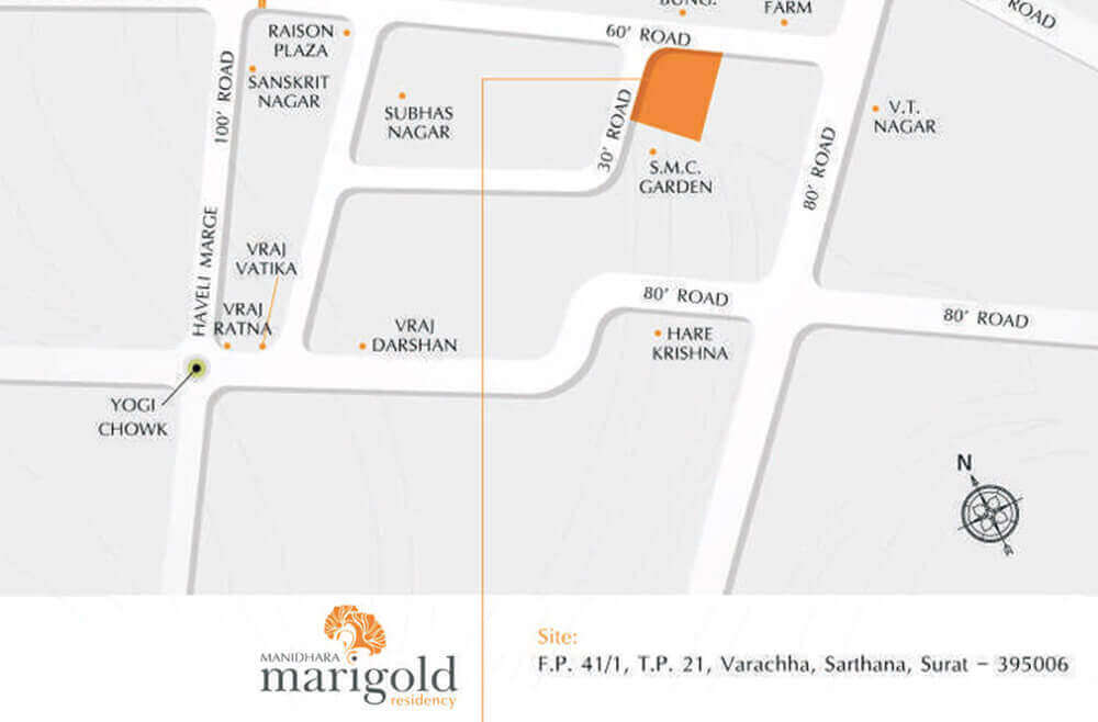 Marigold Residency, at Varachha-Sarthana, Surat, is a heaven of peace and privacy.Two towers, standing 13 floors tall and Three towers, standing 12 floors tall and away from each other, are the luxurious offering that comprises Marigold Residency.